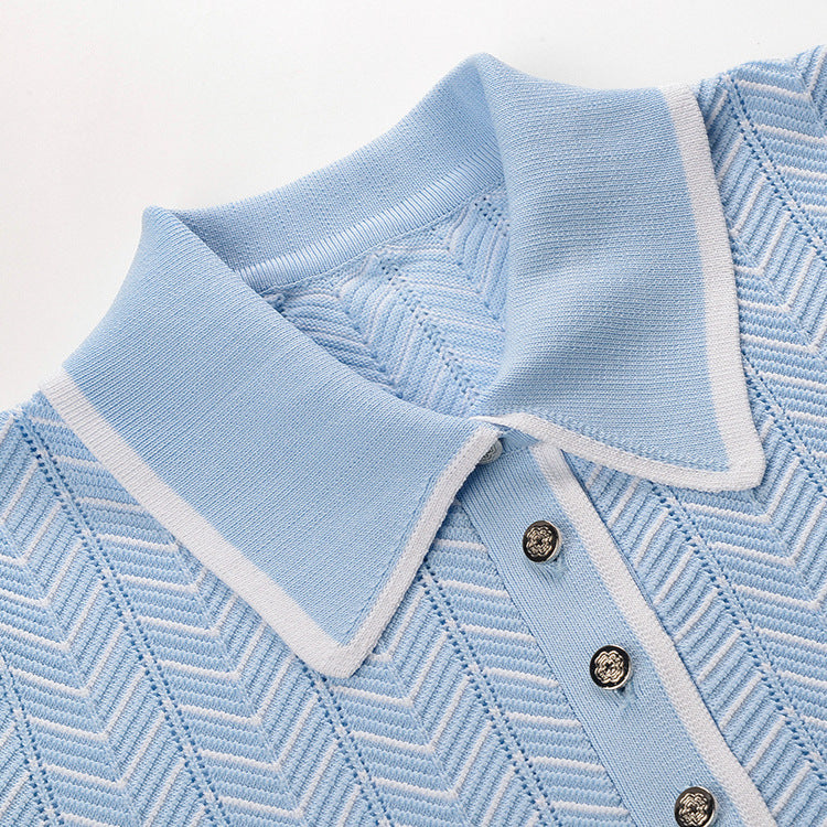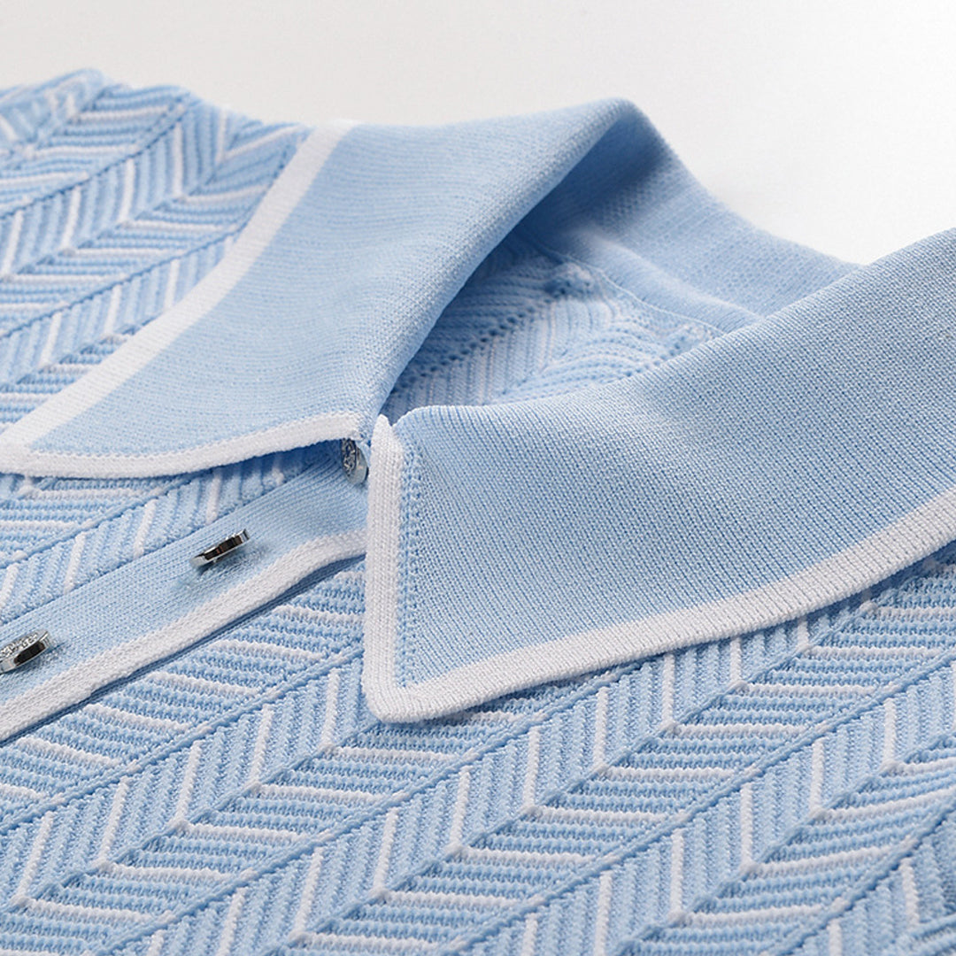 Button-fastening side slits with signature striped grosgrain trim